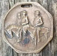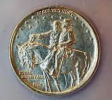 The obverse of the half dollar depicts Confederate generals Lee and Jackson, the latter with head bare, mounted on horseback. Although both Lee and Jackson were respected in the North, Davis would not have been acceptable on a federal coin, and he was omitted, although he appears on the Children's Founders Roll medal which Borglum adapted for the obverse of the half dollar.[26] There are thirteen stars in the upper field of the obverse; they represent the thirteen states which either joined the Confederacy or had Confederate factions. Borglum's initials, "GB", are found on the extreme right of the piece, near the horses' tails. The reverse depicts an eagle with wings stretched, representative of liberty, perched upon a mountaintop. There are 35 stars in the field, supposedly to represent the number of states at the start of the Civil War, although there were in fact 34 in 1861, and there were 35 states only from 1863 to 1864, between the admissions of West Virginia and Nevada.[5][27]