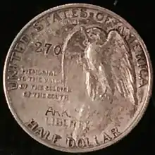 Borglum later stated that the Association asked him to write to people in Washington because of his contacts in the Republican Coolidge administration.[14] He wrote to the powerful Republican Massachusetts senator, Henry Cabot Lodge, urging him to support legislation for a Stone Mountain commemorative coin; the appeal apparently worked, as late in 1923 the committee chairmen having jurisdiction over coinage, Reed Smoot in the Senate and Louis Thomas McFadden in the House of Representatives, introduced legislation for a Stone Mountain Memorial half dollar. McFadden later wrote that he sponsored the legislation because of his friendship with Borglum. With the threat of sectional opposition if the coin only honored the South, the bill's sponsors included language making the new half dollar also in memory of the recently deceased Harding (an Ohioan), during whose presidency the renewed work had begun. The bill passed by unanimous consent in the House on March 6, 1924, and in the Senate five days later; Coolidge signed it on March 17.[15][16] The bill authorizing the coin read: