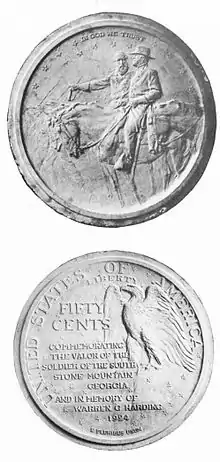 The Stone Mountain Memorial half dollar was an American fifty-cent piece struck in 1925 at the Philadelphia Mint. Its main purpose was to raise money on behalf of the Stone Mountain Confederate Monumental Association for the Stone Mountain Memorial near Atlanta, Georgia. Designed by sculptor Gutzon Borglum, the coin features a depiction of Confederate generals Robert E. Lee and Stonewall Jackson on the obverse and the caption: "Memorial to the Valor of the Soldier of the South" on the reverse. The piece was also originally intended to be in memory of the recently deceased president, Warren G. Harding, but no mention of him appears on the coin.