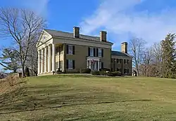 Stonehall is a two-story sandstone Greek Revival house, with a basement and a third-floor ballroom. The house features a prominent a portico containing five slender, unfluted Doric columns, a circular window in its tympanum, and white painted wood trim. Four tall windows face the portico. The main entrance is located on one side, sheltered by a small porch with two Doric columns.[2]