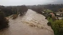 Red flood warnings, the highest level, were issued prior to the storm for the Aude and Agly Rivers,[16] later extended to also include the Ariège and Hers-Vif; flooding was also reported along the River Tech. Severe river flooding and landslides[17] resulted in the evacuation of 2,000 homes across southern France.[18] High winds and flooding disrupted electricity supplies, leaving 23,000 homes without power at the height of the storm.[19]