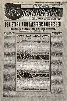 Stormklockan was launched in December 1908 in Stockholm.[1] Zeth Höglund was instrumental in the establishment of the magazine which was started as a weekly social democratic publication.[1] Soon after its start the magazine was made the official media outlet of the Social Democratic Youth.[1] Höglund served as its editor-in-chief.[2] One of the contributors in this period was Allan Wallenius, a Swede from Turku.[3]