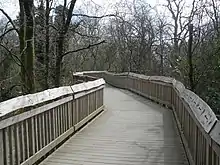 Opened in 2003, the walkway is raised above the ground and follows a 90 metres (300 ft) route through the woodland's lower canopy. This allows a closer view of the mature oak trees, as well as lakes and ponds below. it also features interpretation boards and children's poems and art carved in to the rails.