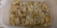 The potatoes are cooked by slow stewing in a closed pot with fat (lard, beef dripping or butter may be used)[1][5] and often a small amount of water[1] or sometimes other liquids, such as milk, stock or meat jelly.[1][4] Stovies may be served accompanied by cold meat[1] or oatcakes[6][7][8][9][10] and, sometimes, with pickled beetroot.[11][12]