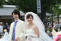 In 2012, the strapless dress was described as the most widely requested style for Western wedding dresses.[20] Vera Wang is sometimes credited with introducing this style of bridal dress in the first decade of the 21st century,[20] although strapless dresses were an increasingly valid option from the 1990s onwards with the growing popularity of formal civil weddings from the 1990s.[21][22] However, for religious weddings, strapless and shoulder-baring styles are potentially controversial,[21] and despite the popularity of the strapless wedding dress it is considered by some to be a "rejection of the virginal ideal".[23]