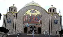 Construction of the new church was completed between 1971 and 1973. Architect Yaroslav Korsunsky of Minneapolis designed the church, employing the Byzantine-Ukrainian style of 11-13th century Ukraine.[2] Churches of this style are traditionally cruciform, with the altar facing to the East. The rounded gold dome, along with a strong preference for circular patterns - avoiding almost all angular design elements - is also typical of this style.
