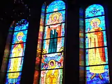 The wooden frame of the iconostas was hand-carved from oak by Paul Mozes of New York. The icons are the work of Ivan Dykyj. The stained glass windows are the work of Yaroslaw Baransky of Yonkers, New York. The windows in the southern apse portray the Protection of the Mother of God, flanked by Saint Volodymyr and Saint Olha. The windows in the northern apse portray some of the patron saints of Ukraine: Saint Andrew the Apostle, who first came to Ukraine to proclaim the word of God, Saint George (Yuriy) the Conqueror, and Saint Michael the Archangel.[5]