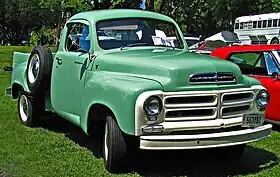 The E series Studebaker trucks are the original 1955 E series Studebaker trucks, sold in half-ton, 3/4-ton, and 1-, 1.5-, and 2-ton capacities, and the 1956: 2E series; 1957-58: 3E series; 1959: 4E series; 1960: 5E series; 1961: 6E series; 1962: 7E series; and 1963-64: 8E series.[1] Given these model-year designations, "E series" has come to mean all Studebaker trucks built between 1955 and the end of all vehicle production in the US in December 1963. Within each tonnage rating, these trucks were all fairly similar, since Studebaker was in dire financial straits during this entire period and invested virtually nothing to update its truck division products. For the 1956 and 1957-58 models, all Studebaker trucks were called Transtar.
