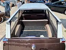 Studebaker developed the Wagonaire version using the standard Lark station wagon body that was modified above the beltline. The roof was designed with a panel over the cargo bay that was manually retracted into and then locked into position in the forward section of the roof. The mechanism includes a simple pair of tracks that allow the rear roof panel to slide forward over the headliner which is lowered to provide clearance. This configuration allowed Studebaker to boast that the Wagonaire could transport items (such as standard size refrigerators) in an upright position.[7] Wagonaires seated six passengers (five with the optional front bucket seats). The car could seat eight when equipped with a rear-facing third-row seat, which was available as an option through 1965. When the third seat was ordered, the cars were fitted with special "Captive-Air" (puncture-resistant) tires, as the additional seat took up the space required for a spare tire and wheel. The drop-down tailgate was available with an attached step to ease egress.