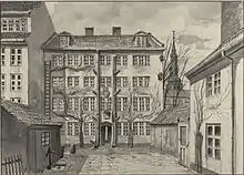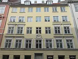 Two smaller houses at the site were destroyed in the Copenhagen Fire of 1795. The two lots were acquired by Carl Christian Madsen for 1,115 rigsdaler and merged. He initiated the construction of a tenement house at the site but had prior to its completion in 1798 already sold it to wigmaker Carl Christian Wegner for 8,500 rigsdaler. The small apartments were rented out to low-income families for a biannual rent of six Danish rigsdaler for a one and a half room apartment (1801).[1] Wegner lived in the apartment on the ground floor towards the street. In 1802, he sold the building for 9,700 rigsdaler. The new owner, Peter Hansen, a former coachman, opened a grocer's shop in the ground floor. The rear wing alone contained 16 apartments. The later playwright and theatre historian Thomas Overskou lived with his parents in one of the small apartments as a child from April 1806. His father was a worker in the sugar refinery at Store Larsbjørnsstræde 9. Hansen and a maid named Margrethe saved the property from the flames during the British bombardment on the night between 3 and 4 September 1807 by putting out 17 bombs and five fire arrows. According to Thomas Overskou, who has described the events in his memoirs, the two people never fully recovered from the physical and psychological stress of the situation. Hansen owned the property until his death 12 years later. His widow sold it to grocer Jeppe Petersen in 1830.[1]