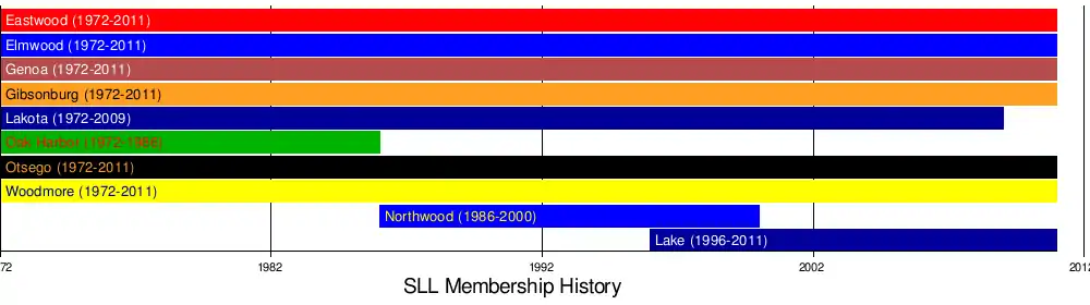 • For the 1972-73 school year, Eastwood, Elmwood, and Genoa leave the Northern Lakes League to form the SLL with Gibsonburg, Lakota, and Oak Harbor from the Sandusky Bay Conference, and Otsego and Woodmore from the Lakeshore Conference. Geographic location and comparable athletic competition were acknowledged as sound reasons for establishing the league.[2]