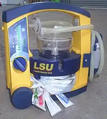Suction devices may be mechanical hand pumps or battery or electrically operated mechanisms. In many hospitals and other health facilities, suction is typically provided by suction regulators, connected to a central medical vacuum supply by way of a pipeline system. The plastic, rigid Yankauer suction tip is one type of tip that may be attached to a suction device. Another is the plastic, nonrigid French or whistle tip catheter.[3]