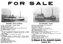 In December 1907, the Pacific Navigation Company advertised itself as the only freight and passenger steamship line between Astoria and Tillamook, Nehalem, Nestucca, Siletz, Yaquina, Alsea, Siuslaw, and Umpqua, Oregon.[15] Also running with Elmore under the line were the steamers Gerald C. and Evie.[15]