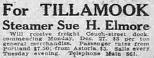 The Elmore was removed from the Portland-Tillamook route because of storms during the winter of 1915–16 and laid up at Astoria.[32] In March 1916, it was hoped that weather conditions in April might allow to the boat to return to service on the route.[32] When Elmore was returned to service in 1916, its schedule was changed so that it now departed Portland every Wednesday night for Tillamook.[33]