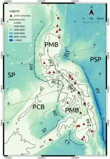 The Sulu Trench is an oceanic trench in the Pacific Ocean, located west of the islands of Mindanao and Sulu in the Philippines. The trench reaches a depth of about 5,600 metres (18,400 ft), in contrast with the average depth of the South China Sea of about 1,500 metres (4,900 ft). The trench formed when the Sunda Plate (part of the Eurasian Plate) subducted below the Philippine Mobile Belt. The convergent boundary terminates at the Negros Trench in the east.[1][2]