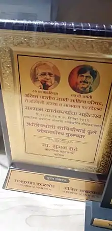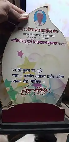 Suman Muthe is the recipient of more than 50 awards from different institutions and organizations from India and Internationally. She has been conferred the Ahilyadevi Holkar Award by the Government of Maharashtra in the past, has also been honoured with Siddha Sewa award by Swami Hardas Foundation in Pune. The foundation has been actively working in India since 1990 and has an active presence in many other countries. The award has been constituted to felicitate those who have shown exemplary contributions to the society. The "Siddha Sewa" award by Swami Hardas Foundation, Pune is her 22nd award in her list of recognitions. In the past she has been honoured with Amrutratna award for the work done for tribal women, Patrashri award for outstanding literary contributions, Patramaharshi award by Journalists Association, National Integration Fellowship award etc. Her participation in various rural projects for conservation of water, tribal women education, childcare education is well known. Besides doing grassroots work, she has written books, poems, delivers lectures and is a prolific writer in Marathi print media.