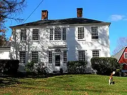The Sumner-Carpenter House is located in a rural area east of Eastford center, on the north side of Old Colony Road just west of its crossing of Bungee Brook. It is a 2+12-story wood-frame structure, consisting of a main block and a series of additions. The main block has a hipped roof, with a side gable-roofed ell, apparently built either with or not long after the main block, with a gable roof, and a c. 1900 two story gable-roofed wing to the rear. The main facade is five bays wide, with a center entrance flanked by wide sidelights, and topped by a rounded transom and corniced entablature. The window above the entrance is in the Palladian style, with a rounded center window flanked by narrower sashes. The interior retains a number of original features, as well as sensitive reproductions of parts that were seriously deteriorated.[2]