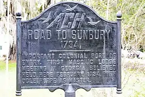 The area that would become the town of Sunbury was first settled by Europeans in 1752 by the families of Benjamin and Samuel Baker, from the British Province of South Carolina.[1] The site was on the south bank of the Midway River,[note 1] in what was at the time the Province of Georgia,[1] on a bluff several miles upriver from St. Catherine's Sound.[2] In 1757, 500 acres (200 ha) of this area was conveyed by King George II of Great Britain to Mark Carr, a wealthy military officer.[3] Carr sold some land lots to other people, and soon several wharves on the river and a trading post were established.[3]