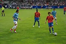 Sunday, who was born in Nigeria, was eligible to play for Spain under FIFA rules allowing players with dual nationality and without full international caps to switch allegiance before the age of 21. After first appearing for the under-19 side, he was called up by his adopted nation to the 2007 FIFA U-20 World Cup in Canada,[22][23] playing four games as the team exited in the quarter-finals.[24]