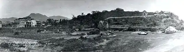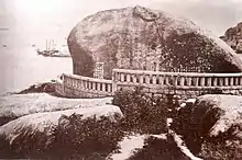 c. 1920s. The boulder bearing the three carved characters is situated on top of the hill (right); both were protected as sacred relics by a special ordinance in 1899. The gate, the steps to the inscription and the balustrade around the boulder were erected in 1915. The hill was levelled and the boulder was broken up in blasting operations to extend Kai Tak Airport.