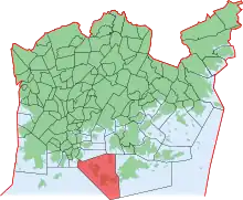 The district of Suomenlinna consists of eight islands, of which the islands of Kustaanmiekka, Susisaari, Iso Mustasaari, Pikku Mustasaari and Länsi-Mustasaari are connected with each other through bridges or causeways. The strait which previously separated the islands of Susisaari and Kustaanmiekka has been filled with reclaimed land. These islands are bordered to the east by the Kustaanmiekan salmi strait and to the west by the Särkänsalmi strait, which are the most important ship routes leading from the open sea to the Kruunuvuorenselkä water area and the South Harbour. Other islands in the Suomenlinna district include Särkkä, Lonna and Pormestarinluodot.[2] The land surface area of Suomenlinna is 2.21 square kilometres, and in late 2017 the district had jobs for 446 persons.[1]