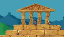 Accurately capturing the sprites of Super Mario World was difficult for the Wacky Worlds development team, since the CD-i had a different sprite-making style than that of the SNES.[8] To create their characters, they copied sprites of Mario and several Koopa Troopas from Super Mario World.[4] Their original designs include a Greek Koopa, knight Koopa, eskimo Koopa, vampire Koopa, and a walrus.[10] The backgrounds were all hand-drawn,[8][4] based on real-world locations.[11]