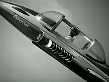 There were several working models of Supercar, which was designed by art director Reg Hill.[11] The larger, hero model was about seven feet (2.1 m) long and cost £1,000 to build.[1] Made of lightweight wood and Perspex), it was constructed by Laurie Barr of Aeronautical and General Modelmakers (now Mastermodels). A mid-sized model, around one metre (3 ft 3 in) long and sculpted by Slough craftsman Bill James, as well as a smaller model measuring about 0.5 metres (1 ft 8 in), were used for the titles. One of the smaller models, used in distance shots, was about nine inches (23 cm) in length and was also sculpted by Bill James. John Peel likens Supercar's appearance to that of the 1959 Cadillac Fleetwood Sixty.[12]