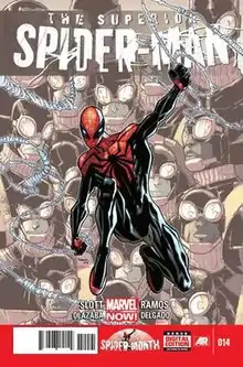 "Superior Spider-Month" is a 2013 comic book branding that ran through all Spider-Man family of books published by Marvel Comics. It began in July 2013, marking a major change in the status quo of the Spider-Man storylines in the aftermath of Superior Spider-Man #13 and saw Superior Spider-Man sporting a new costume, getting a new headquarters and recruiting henchmen. In addition three new titles Superior Spider-Man Team-Up, Superior Foes of Spider-Man and Superior Carnage also debuted while Superior Spider-Man and Morbius: The Living Vampire were also bannered.[1]