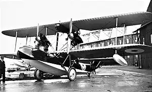 The design incorporated two 238 horsepower (177 kW) geared Armstrong Siddeley Lynx IV radial engines driving wooden tractor propellers.[7] The fuel, stored in a tank mounted on the top plane, was fed by gravity to the engines. According to a 1929 article in Flight, the fuel load of 135 imperial gallons (610 L; 162 US gal) of petrol was estimated as providing the aircraft with a range of around 300 miles (480 km).[8]