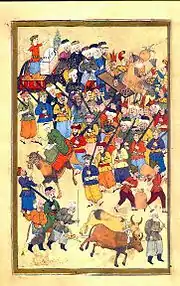 The Surname-i Hümayun (Ottoman Turkish and Persian: سورنامه همایون, romanized: Imperial Festival Books) were albums that commemorated celebrations in the Ottoman Empire in pictorial and textual detail. Such celebrations included mainly imperial weddings and circumcision festivals. These albums were commissioned by the Ottoman Imperial family, usually by the Sultan presiding at the time. The Surnames recount the festivities in order of when the events took place, which includes processions, grand entrances of the Sultan, feasts, entertainers, musicians, dancers, gift giving, firework displays, circumcision and wedding ceremonies. Although many of the Surnames were made to celebrate circumcisions of Ottoman princes, the first Surname was commissioned in 1524 for a wedding ceremony.[1]