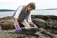Shaw examining a harbor seal