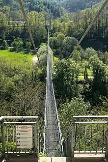 The Suspension Bridge of San Marcello Piteglio (or in Italian, Ponte sospeso di San Marcello Piteglio) is the longest pedestrian suspension bridge or suspension footbridge in Italy, spanning the river Lima between the neighborhoods of Popiglio and Mammiano Basso, both located within the town limits of San Marcello Piteglio, province of Pistoia, region of Tuscany, Italy.