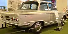 Introduced in August 1965 (and on sale by December), the Fronte 800 was an attempt at competing in a higher market segment than the Suzulight Kei jidosha class offerings. The name from its smaller engined brother, the Fronte, was retained to aid the publicity effort. A four-door 700 cc prototype was shown at the 1962 Tokyo Motor Show, clothed in a body designed by Pietro Frua, reminiscent of his Maserati Quattroporte I and Glas 1700 saloons.[1] This line of development was not followed, with work on the Y4 prototype instead begun in 1962, another prototype appearing at the 1963 Tokyo Motor Show. Imminent production was announced, but at the '64 Motor Show another pre-production model was shown, with sales promised for the spring of the following year. Actual production, never but in a small scale and largely hand built, began in December 1965.[1]