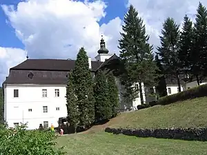 A chapel richly decorated with frescoes of a late-baroque illusionist space with a free view emerges from the southern tract of the mansion. It is dedicated to the Assumption of the Virgin Mary.[2] The chapel is also highlighted on the outside on the facade, which ends with a fresco connecting the church theme with the motif of the image of the donor.