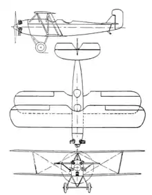 The Falken trainer, closely related to the Jaktfalken fighter, was derived from the earlier Piraten. It was a single bay biplane with unswept, constant chord, thin section wings. Both wings were built around rectangular section steel spars and were fabric covered. They were mounted with light dihedral but with stagger so strong that the forward lower spar was directly below the upper aft one. Because of the stagger and a slightly shorter lower wing the N-form interplane struts leant both forwards and outwards. The upper wing was supported over the fuselage by a cabane formed by a pair of lateral, inverted V-struts to the forward spar and a single, transverse inverted V to the aft spar. There were long, broad ailerons on both upper and lower wings, externally linked by streamlined tubes.[1]