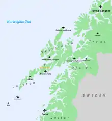 Two locations have been put forward, Gimsøya (68°19′10″N 14°9′30″E / 68.31944°N 14.15833°E) and Hadselsanden (68°25′40″N 14°37′30″E / 68.42778°N 14.62500°E). The former could replace Leknes Airport and Svolvær Airport, Helle, the latter could also replace Stokmarknes Airport. As both alternatives imply direct services to Oslo, the leakage to Evenes Airport would be reduced.[3] Gimsøy was the most favoured alternative since Stokmarknes needs ferry access if its airport is replaced, or a future tunnel which seems to expensive, and because Hadselsanden is fairly distant from Leknes (113 kilometers (70 mi)). However weather recordings has shown that Gimsøy, located at the big ocean, is too windy and foggy for an airport.[4] Therefore, the main option now is to extend Leknes, considering that Svolvær airport has no room for extension.
