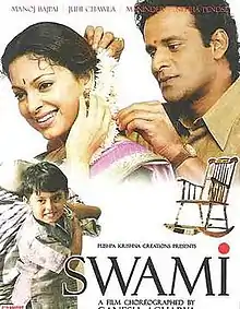 Swami is a 2007 Indian Hindi drama film, directed and also choreographed by Ganesh Acharya and Screenplay by Bhavani Iyer and Muazzam Beg.[1] The main cast consists of Juhi Chawla and Manoj Bajpai. In a first of its kind attempt, the background music score of Swami was recorded before shooting the film. The music of this film is by Nitz 'N' Sony. They are the First Music Composers in the history of World Cinema, to have recorded the Background Music Score of a Movie, even before the film was shot. Also, they are the first one's to have recorded a Folk Ganpati Mandal (The Best in Maharashtra), live in 5.1 channels, overnight in an open-air makeshift studio, constructed specifically in an open ground in Film City Mumbai; for the movie Swami. This is the only 5.1 recording of a Folk Ganpati Mandal ever done. The music of the film has been incorporated in a U.S film school curriculum as well, while drawing immense critical acclaim from music critiques worldwide.