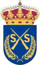 The coat of the arms of the Swedish Infantry Combat School (Infanteriets stridsskola, InfSS) 1982–1991. Blazon: "Azure, two muskets in saltire between two letters of S, inside an open chaplet of laurels, all or".[7]