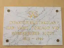 When the Swedish Infantry Gunnery School was organized in 1878, it came to be placed at Rosersberg Palace. At Rosersberg, the school was located until 1961. When the school was relocated temporarily to Linköping Garrison on 19 May 1961, a ceremony was held at Rosersberg, and on 1 July 1961 the area was handed over to the Swedish Civil Defence Board. From 1 September 1961, the school officially operated in Linköping, where it was co-located with the Life Grenadier Regiment (I 4) and located to barracks 2. On 15 May 1963, parts of the school were moved to Kvarns bruk, where the whole school was located in 1966.[3] The facility in Kvarns bruk was taken over by the Combat School Middle.