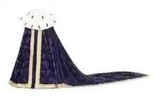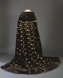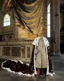 Eric XIV's coronation robe is the oldest garment that has been kept from a Swedish coronation. It is a velvet robe in a deep purple colour. Originally the robe was decorated with 455 golden crowns. The crowns are embroidered with golden, white, blue and pink silk, and on each crown ten small pearls were attached. Today only 296 of the crowns remain.[2] When king Eric was crowned the robe also had a trimming and a collar made out of ermine. After Eric XIV, John III, Charles IX and Gustav II Adolf have used the robe during their coronations.[3]