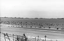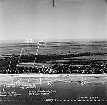 Sword stretched about 5 miles (8.0 km) from Saint-Aubin-sur-Mer in the west to the mouth of the River Orne in the east. It was further sub-divided into four landing sectors; from west to east these sectors were 'Oboe' (from Saint-Aubin-sur-Mer to Luc-sur-Mer), 'Peter' (from Luc-sur-Mer to Lion-sur-Mer), 'Queen' (from Lion-sur-Mer to La Brèche d'Hermanville), and finally 'Roger' (from La Brèche d'Hermanville to Ouistreham). Each sector was also divided into multiple beaches.[32] The sector chosen for the assault was the 1.8 miles (2.9 km) wide 'White' and 'Red' beaches of 'Queen' sector, as shallow reefs blocked access to the other sectors.[33] Two infantry battalions supported by DD tanks would lead the assault followed up by the commandos and the rest of the division;[34] the landing was due to start at 07:25 hours.[35]