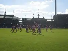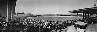 In 1896 the Ladies' Stand was opened, along with a concrete cycling track which circled the inside of the ground.[3] One of the carpenters who built the formwork for the track was George Bradman, father of Don Bradman. In 1898 floodlights were built over the cycling track so that night events could be held. In 1904 the scoreboard was rebuilt at the top of The Hill and in 1909 the Sheridan Stand, named after Phil Sheridan, was opened at the southern end, replacing the earlier Smokers' Stand.