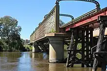 The first rail crossing was by a temporary wooden bridge erected by the Victorian government, while the permanent structure was to be a NSW responsibility, the cost of both being shared by the two colonies.[7] The components for the massive iron bridge had to be ordered from England.[3] The piers were 9 feet (2.7 m) diameter cast iron cylinders, sunk deep into the river bed and filled with concrete.[8] Construction of the iron bridge began in 1883[9] and it was open to rail traffic in August 1884. Initially the bridge carried both standard and broad-gauge lines so that the south-bound train could terminate at Wodonga, but this hated[6] practice was discontinued from 1 March 1886 and Albury became the transfer point in both directions for passengers and freight. As a concession to Wodonga, transfer of livestock would be made on that side of the river.[10]