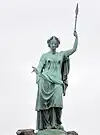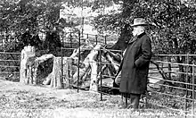He purchased and paid for the erection in Friary Park in May 1911[8][11] of a statue of Queen Victoria as Peace that was grade II listed by Historic England in 1983.[6] It bears a dedication dated 7 May 1910 to the memory of Edward VII who died on 6 May 1910.[6] It stands on 200 tons of rock from Devon, shaped in the form of a tor.[8] The statue originally had Victoria holding a dove but at some time that was changed to a spear.[11] The statue was restored by Barnet Council in 2022 and the dove reinstated.[11]