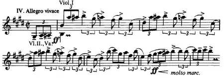 The final movement is set in sonata form. The lively, fanfare-like first theme, derived from the first "Dies Irae"-like theme of the Scherzo, is played by the entire orchestra, leading into a march-like interlude starting in G# minor played by woodwind.