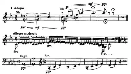 After its slow introduction, the first movement leads to a theme of Mendelssohnian (or Schubertian) character, followed by a second subject of a gentler cast, with various secondary themes played in major, and soon after repeated in minor forms; chromatic patterns play an important role in both movements. This material is worked out in fairly classical sonata-allegro form, and gradually fades to a quieter mood, which becomes a slightly ominous series of plucked notes in cello and bass, ending on a G pitch, followed by a slow and soft sustained A♭ note in the organ, resolving into the new key of D♭ major for the poco adagio section of the movement. This evolves into a dialogue between organ and strings, recalling the earlier main theme of the movement before the recapitulation. The movement ends in a quiet morendo.