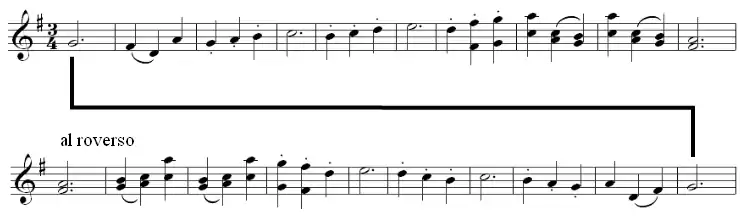 - ↑ Mark Evan Bonds, "Haydn's 'Cours complet de la composition' and the Sturm und Drang", in Haydn Studies, ed. W. Dean Sutcliffe, Cambridge: Cambridge University Press (1998): 166. "The most extraordinary of all canonic movements from this time is of course the 'Minuet al rovescio' from Symphony No. 47 in G major (1772), later re-used in Sonata No. 41 in A major Hob. XVI:26 (1773). Here Haydn writes out only one reprise of a two-reprise form, and the performer must play the music 'backward' the second time around."