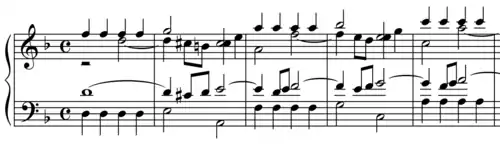 4 time, dominated by a motif established in the opening bars and consisting of two descending pairs of notes, firmly establishing the home key by using only notes in the D major triad.