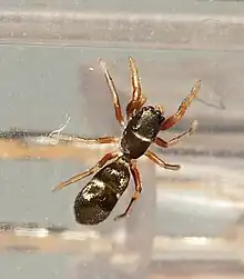 These spiders are virtually indistinguishable from ants, even for humans looking at them rather closely. They move rapidly like an ant, and even raise their second pair of legs like an ant's antennae. Hand-raised tits that had never come in contact with ants ate spiders of this species readily. However, after their first encounters with real ants, and the nauseating effect of their formic acid, they refrained from eating S. venator.[1]