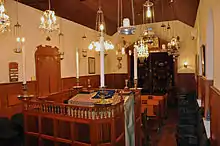 The interior of the building was destroyed by fire in 1913. The architect who was responsible for its reconstruction was an Italian who was more familiar with the architecture of Catholic churches.[3] As a result, the Flemish Synagogue now has a beige, Dutch exterior and an Italian interior, with marble, and a reading desk incorporated into the ark for the Torah, instead of it's original position in the centre of the building. The interior design was originally modelled after the Amsterdam Esnoga. After 1945, Moroccan tiles were installed in the interior of the synagogue, which has ornately patterned ceilings and walls.[2][3] The only remnant of the original garden was a single palm tree in the synagogue's courtyard, which was removed in 2023.[3] The Flemish Synagogue, which remains an active place of worship, is located at 65 Line Wall Road.[4][14]